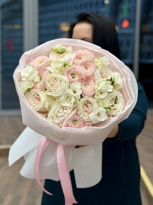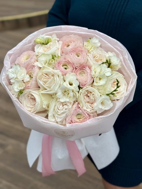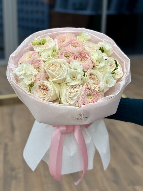 Нежный букет, букет из роз, букет из ранункюлюсов, букет с фрезиями, пастельный букет, букет на подарок, букет для возлюбленной, розовый букет, живые цветы, флористическая композиция