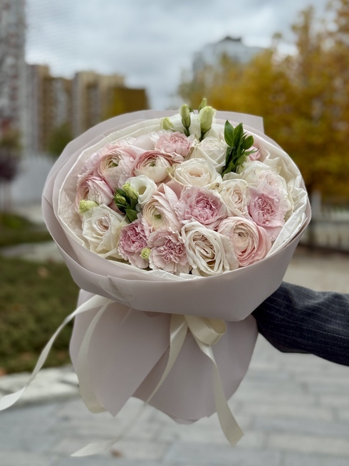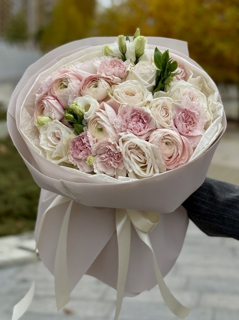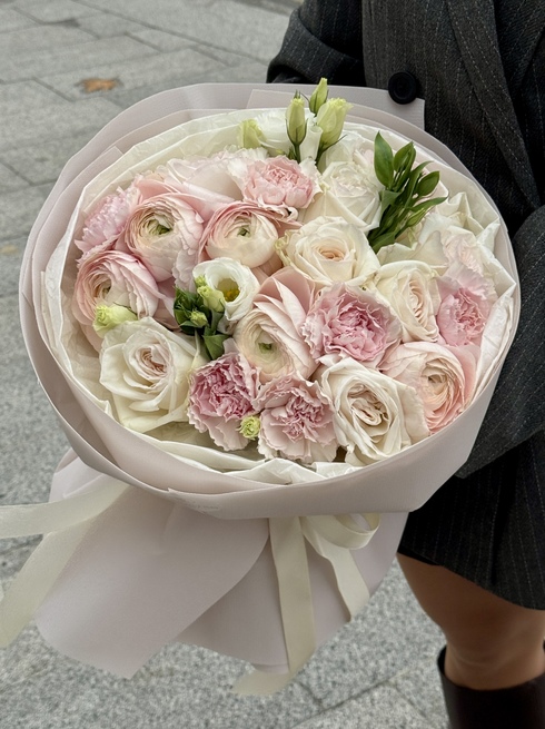 Этот букет — воплощение утончённости и нежности. Мягкие оттенки розового, кремового и белого создают лёгкое, воздушное настроение. В композиции гармонично сочетаются розы, ранункулусы, гвоздики с лёгким ароматом и изящная эустома, придающая букету лёгкость и романтичность.