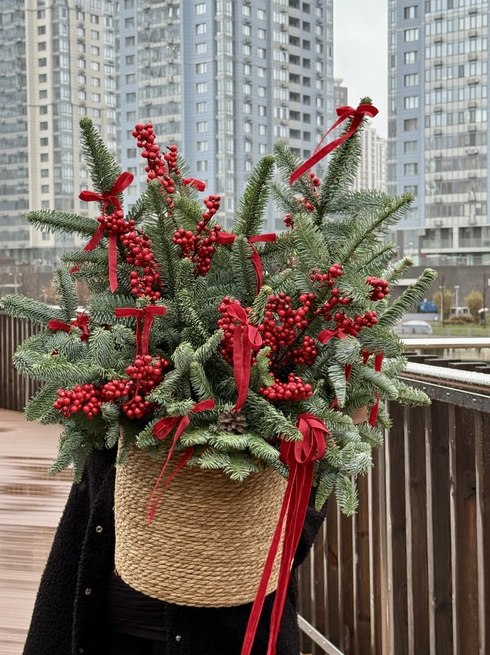 The arrangement is placed in a woven basket that enhances the natural look of the design and makes it an ideal decoration for both home and office. Fresh greenery fills the space with a pleasant pine aroma and brings the feeling of a true winter fairy tale.