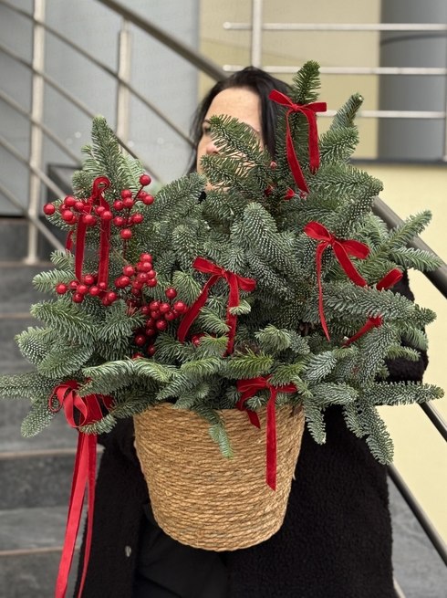 The arrangement is placed in a charming woven basket that highlights the natural, cozy design, making it a perfect decoration for your home or office. Fresh greenery fills the space with a pleasant pine aroma, adding a touch of true winter magic.