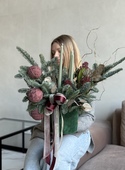 Мы используем натуральную ель, стильные украшения и качественные ленты, чтобы композиция выглядела премиально и гармонично. Подходит для праздничного стола, камина или новогоднего оформления интерьера.
