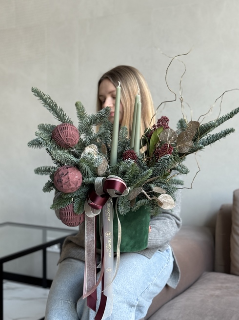 Композиция «Рождественская Элегантность» от студии флористики «Лепестки» — это сочетание свежей ели, бордовых шаров, изящных декоративных элементов и трёх высоких свечей. Композиция наполняет помещение атмосферой уюта, тепла и рождественнего настроения. Идеально подходит для дома, офиса, кафе, отеля или в качестве подарка.