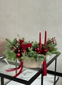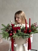 Новогодняя композиция от студии Лепестки — эффектное праздничное украшение в насыщенной красно-зелёной палитре. Живая хвоя, бордовые шары, ягоды, ленты и две свечи создают уютную атмосферу Рождества и Нового года. Бархатный красный олень добавляет композиции сказочности и тепла. Такая композиция идеально подойдёт для праздничного стола, камина или в качестве подарка. Доставка по Киеву и пригороду.