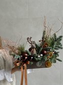 Эта изысканная композиция сочетает в себе уют и праздничное настроение. В деревянном кашпо размещён бархатный олень, новогодние игрушки, декоративные веточки и ароматные сушёные апельсины.