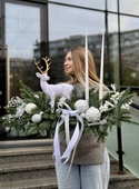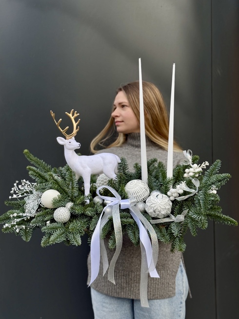 Композиция «Белый Олень» от студии флористики «Лепестки» — это гармоничное сочетание свежей ели, бело-серебристых украшений и двух высоких свечей. Центральная фигура — белый олень с золотыми рогами — создаёт сказочную атмосферу и добавляет композиции утончённости.Композиция идеально подойдёт для оформления дома, офиса, ресепшена, кафе, ресторана или в качестве стильного новогоднего подарка. Выполнена в изысканной холодной палитре — белый, серебро, зелёный — она наполняет пространство ощущением зимней чистоты и праздника.Студия «Лепестки» более 15 лет создаёт премиальные новогодние композиции с доставкой по Киеву.