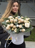 Мягкие пастельные оттенки роз создают атмосферу романтики, а декоративные элементы придают композиции новогодний шарм. Коробка выглядит современно, аккуратно и очень по-зимнему — идеальный вариант для подарка или уютного декора.